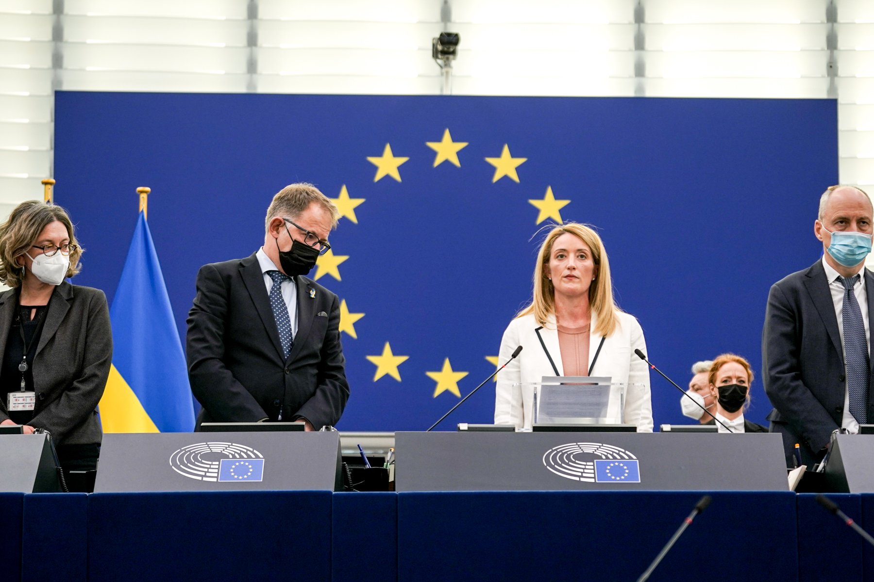 El presidente Metsola llevó a los eurodiputados a observar un minuto de silencio para conmemorar a las víctimas de Bucha, Irpin y todas las víctimas de la guerra, el terror y la violencia.
